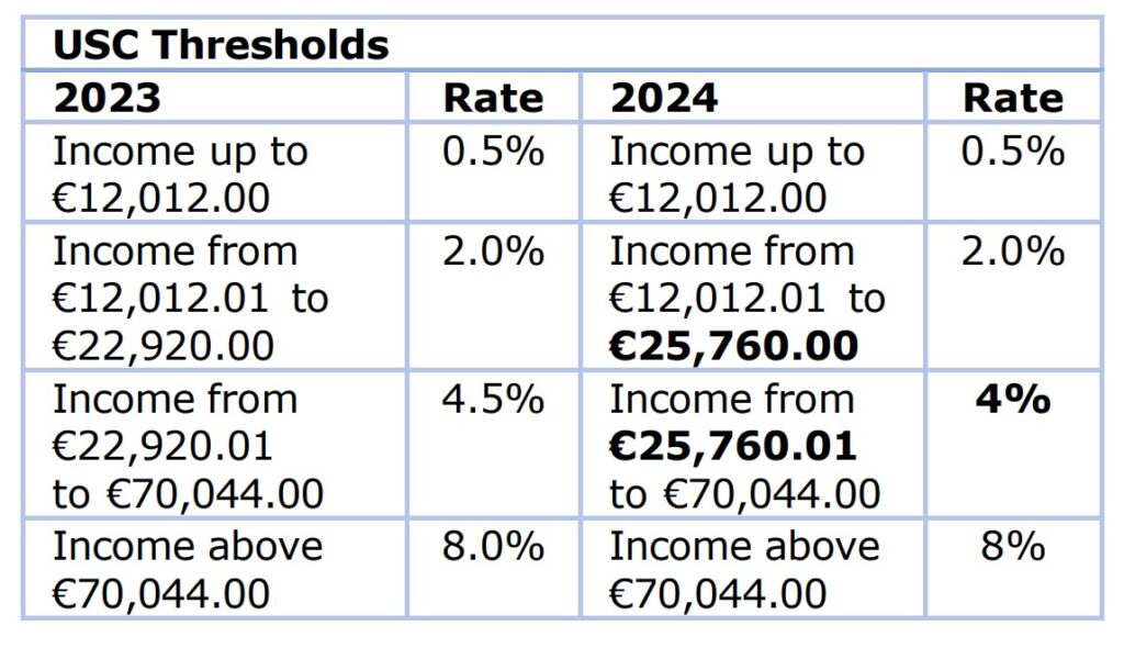 - The USC exemption earnings threshold of €13,000 remained unchanged