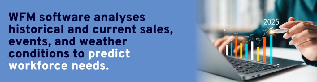 Enterprise workforce management software can use AI to optimise schedules and accurately forecast labour demand. This means that staff can be allocated to tasks as efficiently as possible. The software analyses everything from past holiday trading to current sales, customer footfall, nearby events and even local weather to predict workforce needs.
